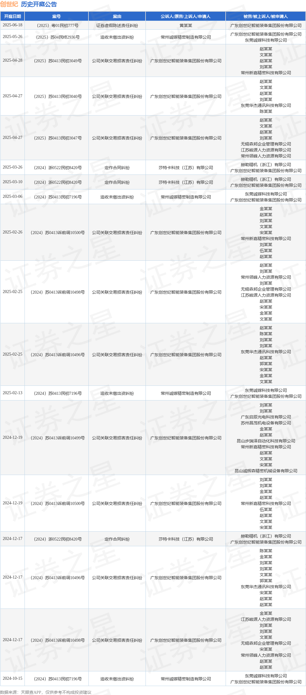 案号:(2025)粤01民初777号审理法院:广东省广州市中级人民法院案由:证券虚假陈述责任纠纷当事人信息: 原告/上诉人:黄某某 被告/被上诉人:广东创世纪智能装备集团股份有限公司开庭日期:2025年6月18日根据统计,近一年内以广东创世纪智能装备集团股份有限公司为当事人的历史开庭公告有18则,其中案由为“公司关联交易损害责任纠纷”的公告以10则居首,其次为“追收未缴出资纠纷”有4则,“定作合同纠纷”有3则。历史开庭公告如下: